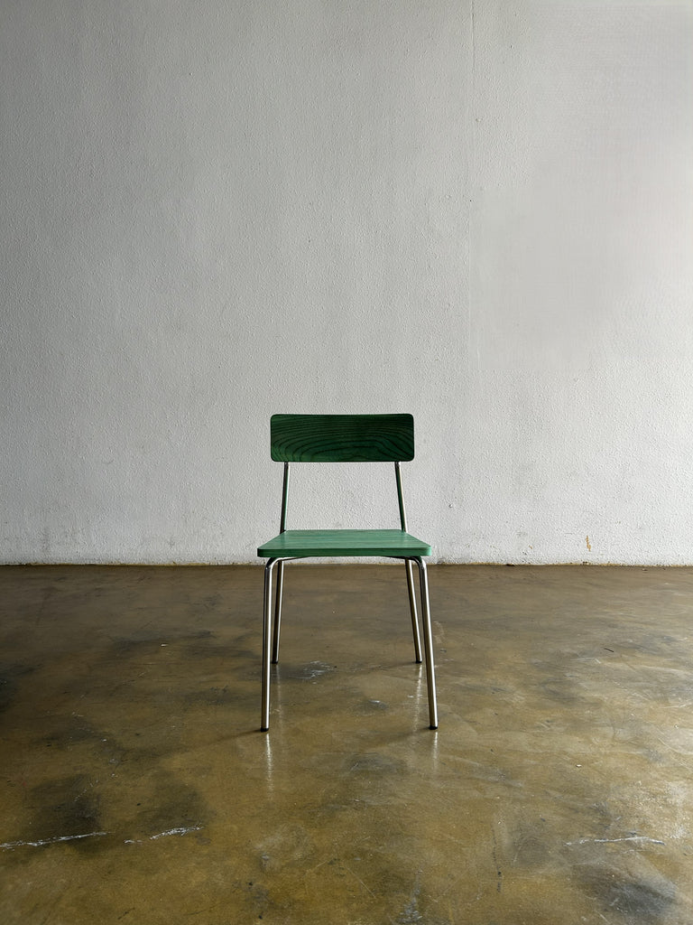 The chair in the fifth picture is finished in Green Stained Sungkai with Stainless Steel.