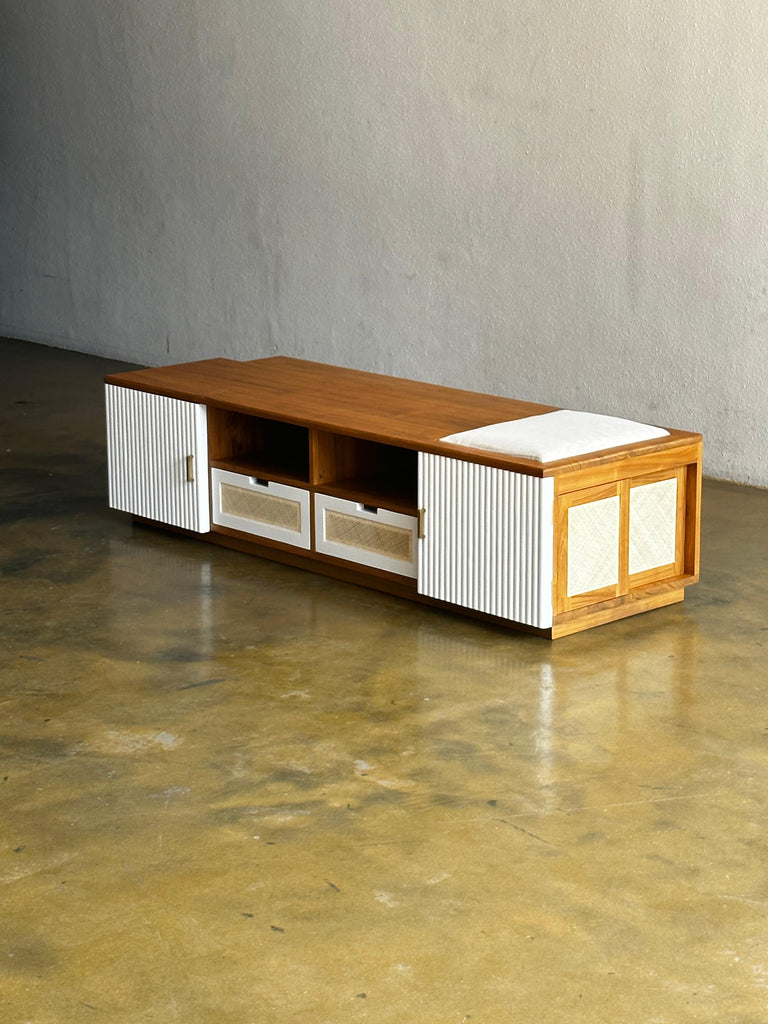 The bench pictured is L180cm in Natural Teak and Semi-Matte White