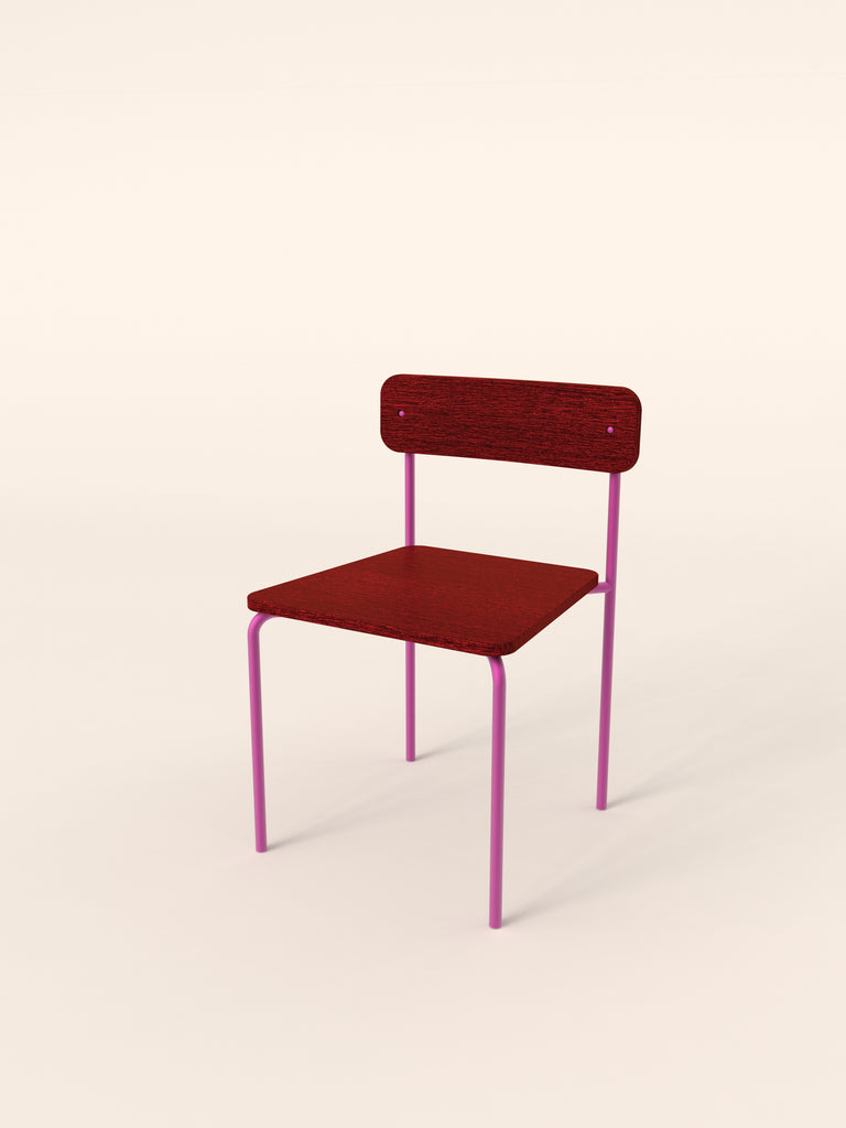 The chair in the fourth picture is finished in Red Stained Sungkai with Pink Powder Coated Mild Steel.