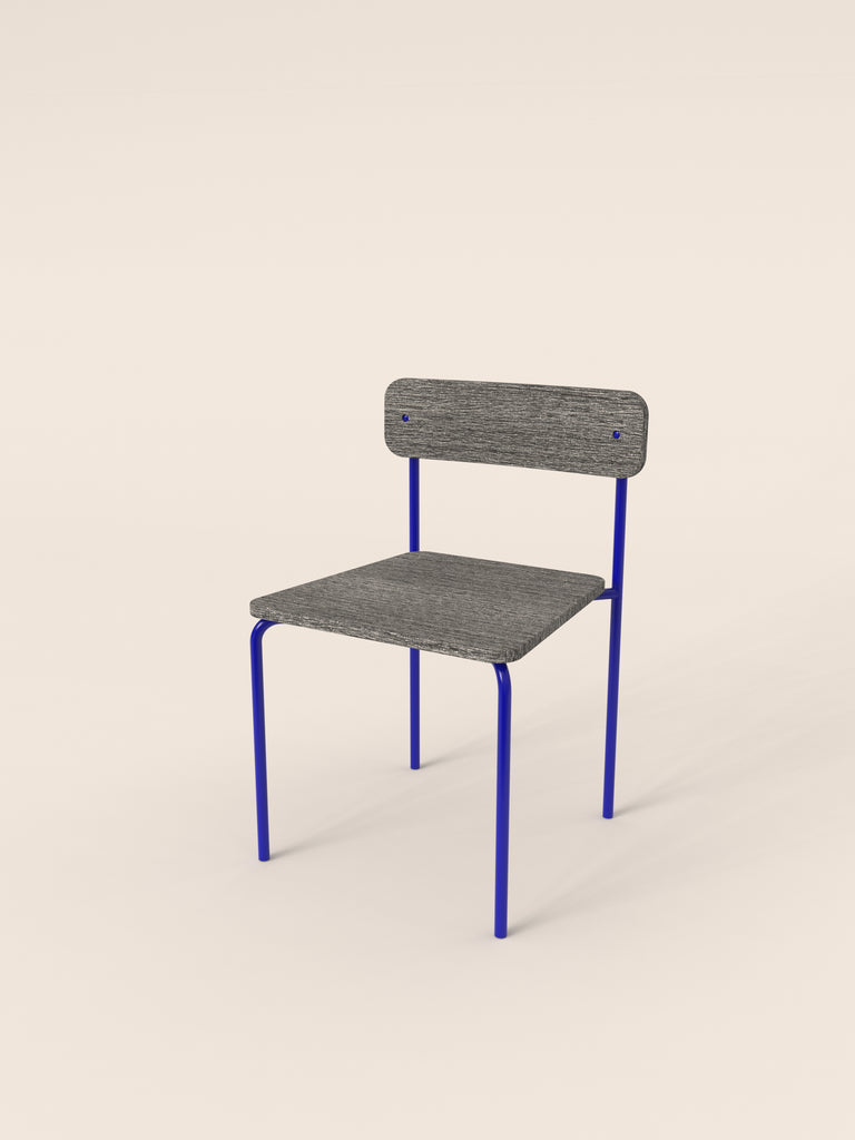 The chair in the sixth picture is finished in Grey Stained Sungkai with Blue Powder Coated Mild Steel.